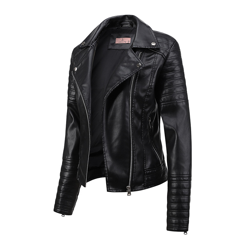 Women’s leather jacket Women’s temperament Slim fit Women’s coat PU leather jacket(Black Color)