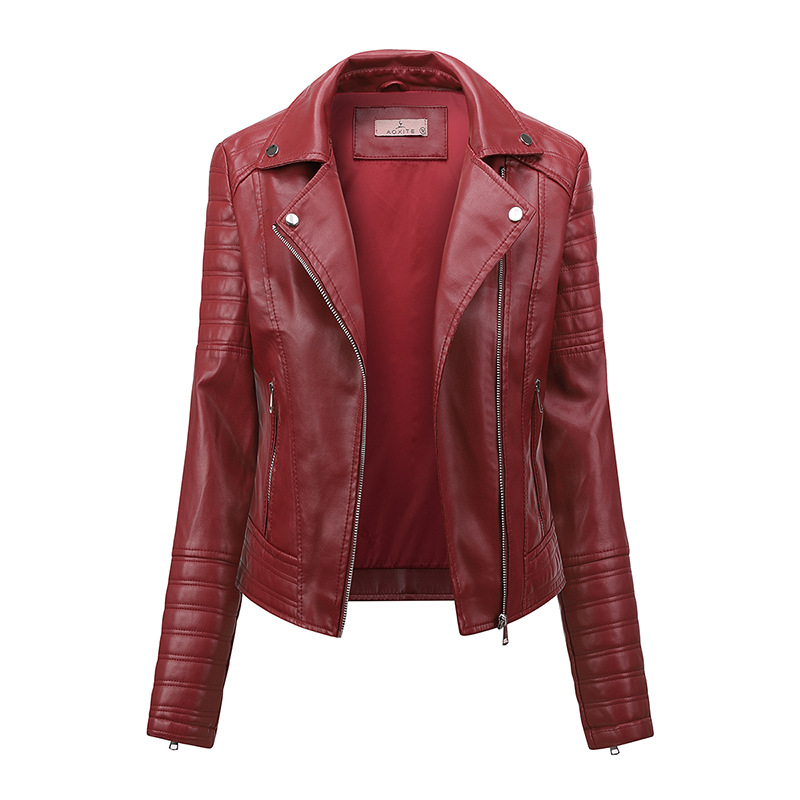 Women’s leather jacket Women’s temperament Slim fit Women’s coat PU leather jacket(Red Color)